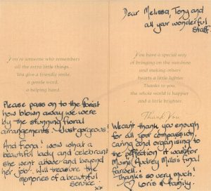 Can I express my thanks to you and the whole team for all your support during what is a very hard time. Each and every team member we dealt with have been so caring, professional and lovely and I just wanted to thank you all on behalf of my whole family.